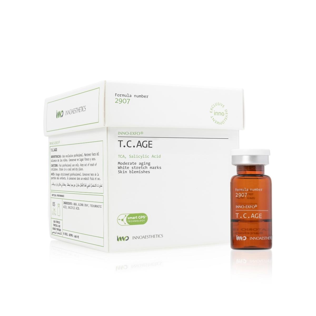 INNO-EXFO T.C.AGE is a reliable way to quickly rejuvenate the skin and refresh its appearance. The main ingredient in the peel - TCA (trichloroacetic acid) - is one of the strongest organic acids used for exfoliation treatments and allows for deep cellular rejuvenation of the skin. During the treatment, there is a protein coagulation reaction, which is observed as the frosting phenomenon.