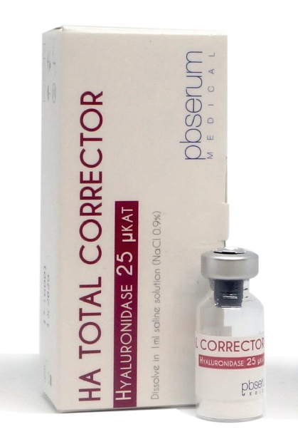PBSerum Total Corrector is a preparation that has the best hyaluronidase on the market, which, in the process of hydrolysis, eliminates the effects of improper administration or allergic reactions after the application of hyaluronic acid-based fillers. The process of complete breakdown and removal of hyaluronic acid from the body lasts up to 3 weeks, while the first effects are noticeable after a few minutes. The enzyme can be applied directly after hyaluronic acid administration or at any other time, even after a few months from the filler treatment. As a result of hyaluronidase administration, the excess acid is hydrolyzed, the skin in the area of application becomes smooth, and edemas are significantly reduced.