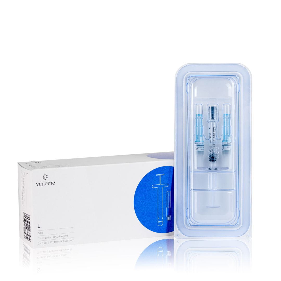 Venome L is a product intended for the reduction of medium and deep wrinkles as well as volumizing. Products from the Venome Filler line are characterized by a high degree of safety. The technological process is based on the combination of hyaluronic acid (of non-animal origin with a high molecular weight and small differences in particle size) with a physiological buffer solution, which hydrates the formula and creates a three-dimensional network of acid. The use of properly selected filler parameters guarantees high plasticity and treatment effects that last from 6 to even 9 months.