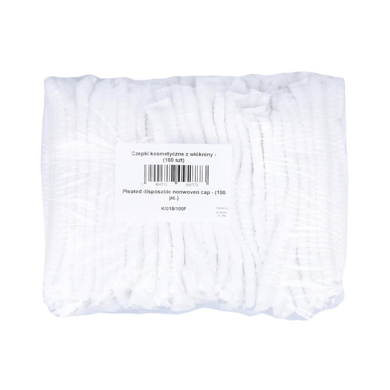 Białe czepki medyczne wykonane z delikatnej włókniny typu Spunbond. Czepki są ściągane gumką na całej długości obwodu i złożone w harmonijkę.
