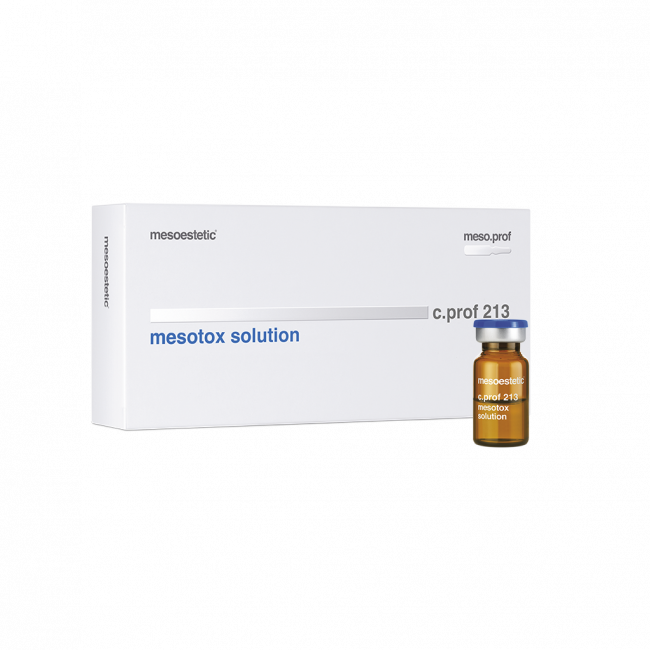 Koktajl Mesoestetic c.prof 213 mesotox jest sterylnym roztworem o fizjologicznym pH przeznaczonym do podania śródskórnego. Redukuje zmarszczki i zapobiega powstawaniu nowych. Zwiększa efektywność toksyny botulinowej w skórze i z czasem wydłuża jej działanie. Dzięki  synergistycznemu połączeniu peptydów c.prof 213 mesotox stanowi alternatywę dla toksyny botulinowej albo wzmocnienie i wydłużenie efektów zabiegów botoksem (efekt "botox-like").